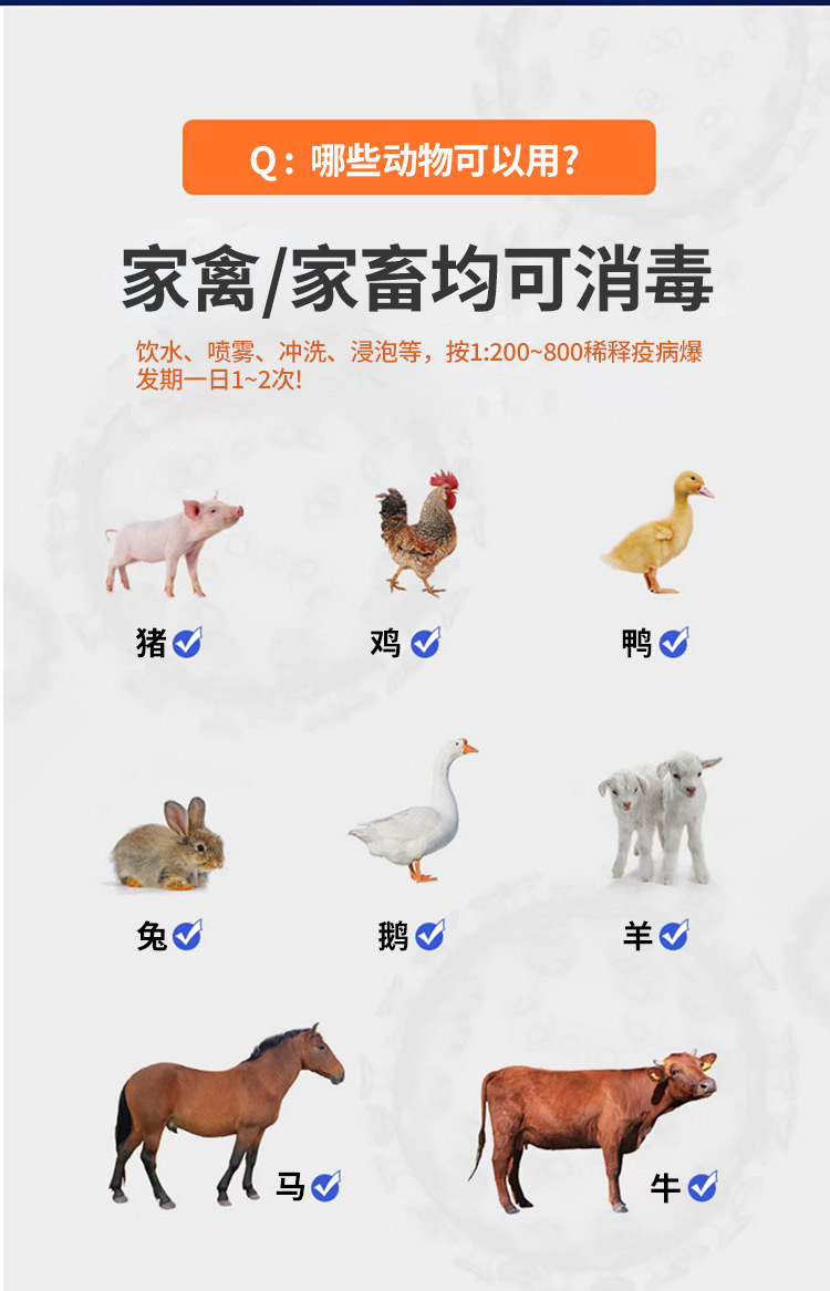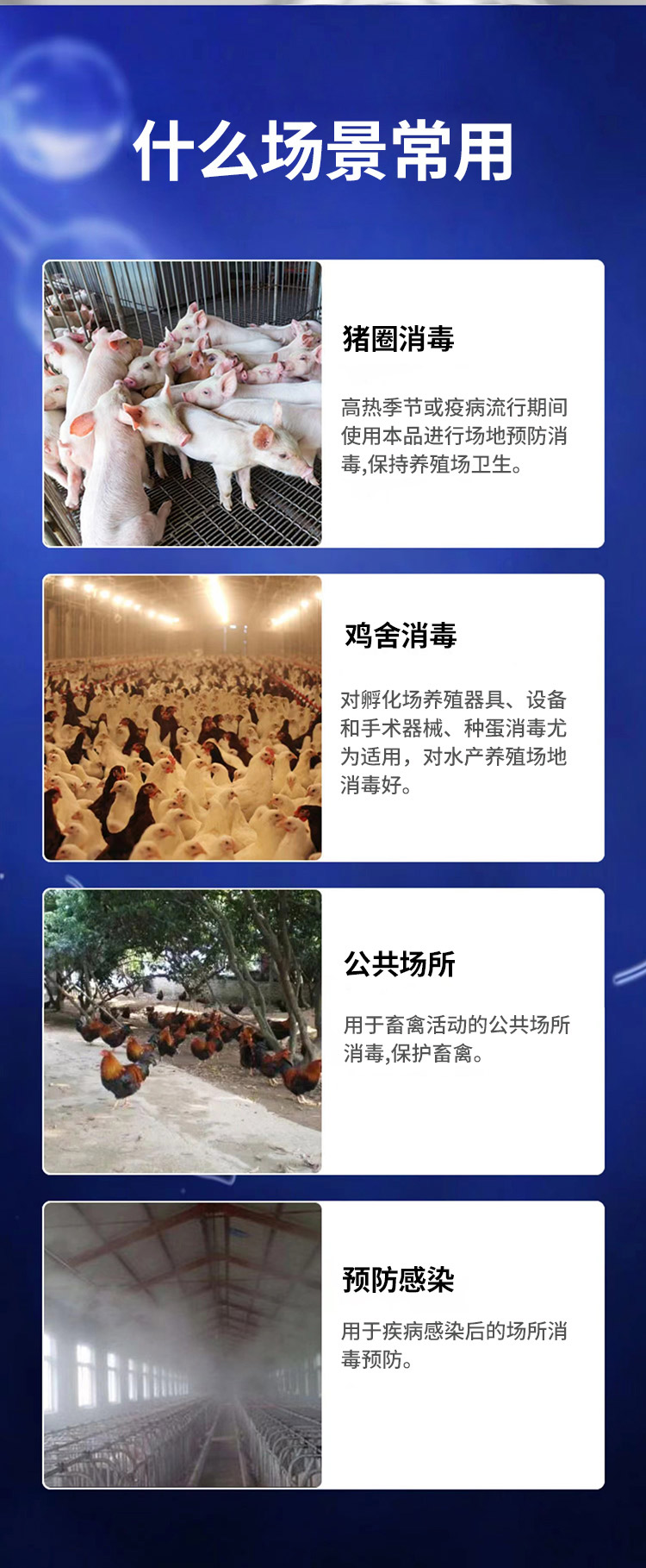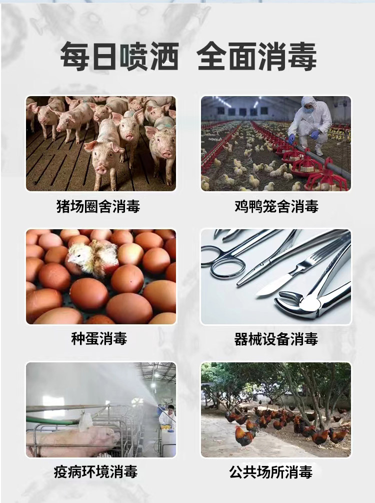 2適用于家畜口蹄疫、藍(lán)耳病、烈性、溫和性豬瘟、圓環(huán)病毒、藍(lán)耳病、弓形體、附紅細(xì)胞體、鏈球菌、傳染性胃腸炎、流行性瀉痢及無名癥的傳染性高熱病等病毒性、細(xì)菌性疾病的消毒預(yù)防。