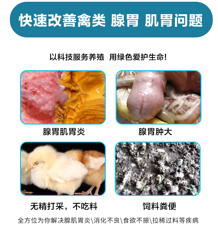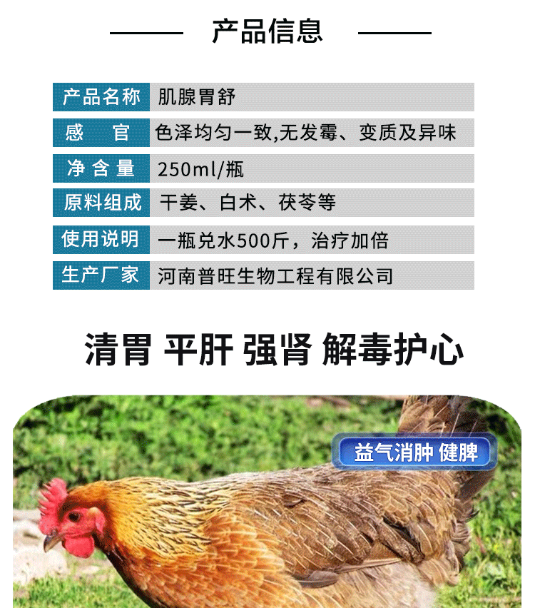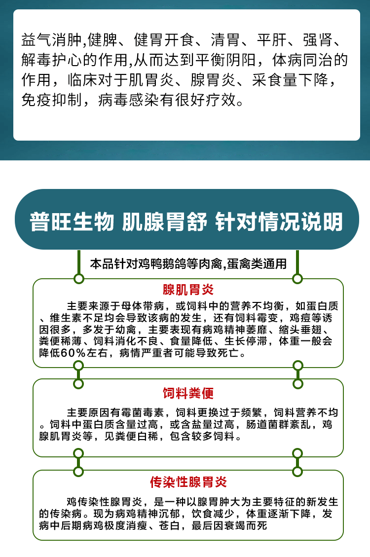 【適用范圍】益氣消腫,健脾、健胃開(kāi)食、清胃、平肝、強(qiáng)腎、解毒護(hù)心的作用,從而達(dá)到平衡陰陽(yáng),體病同治的作用,臨床對(duì)于肌胃炎、腺胃炎、采食量下降,免疫抑制,病毒感染有很好療效。