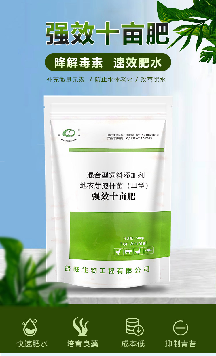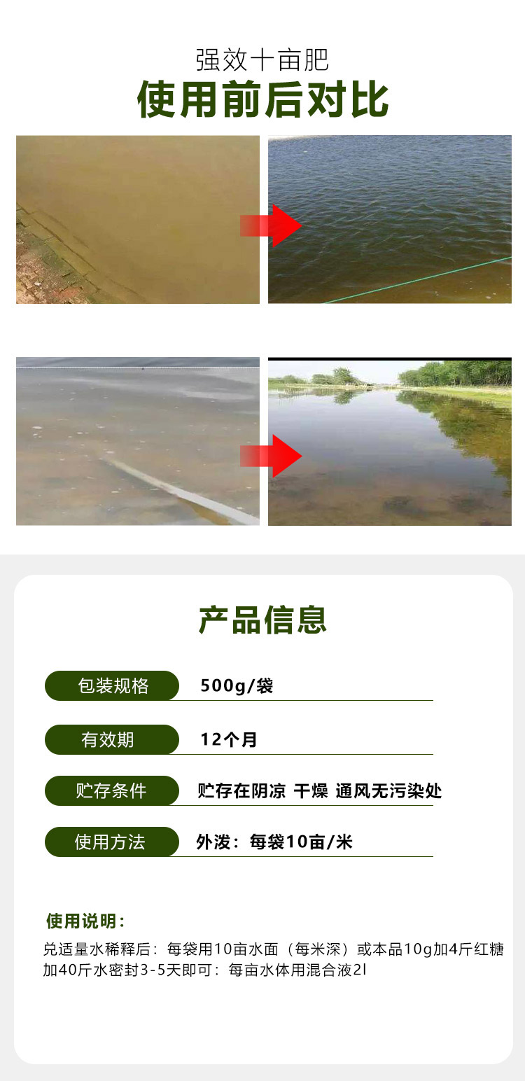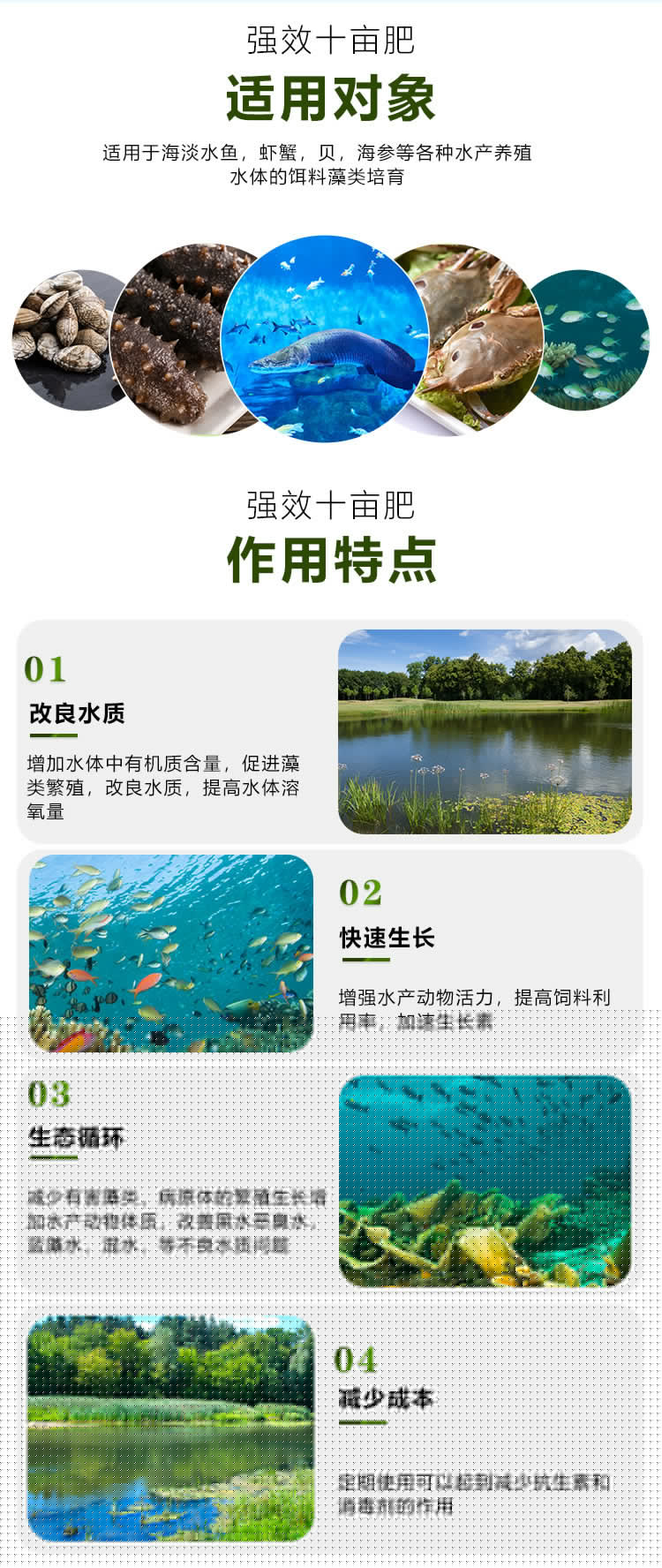 產(chǎn)品簡介:強效十畝肥 降解毒素 補充微量元素 速效肥水 防止水體老化 適用于海淡水魚、蝦蟹、貝、海參等各種水產(chǎn)養(yǎng)殖水體的餌料藻類培育。