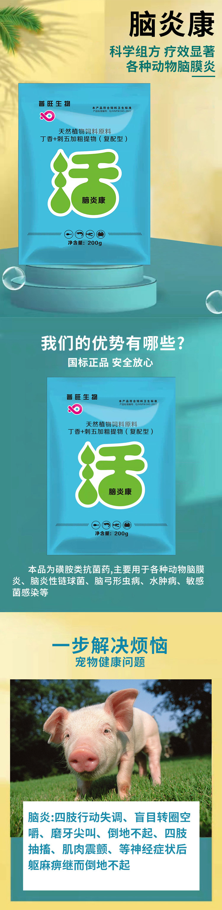 產(chǎn)品簡介:普旺獸藥廠家水產(chǎn)藥 腦炎康獸類消炎抗菌藥 科學(xué)組方療效顯著各種動物腦膜炎 腦炎性鏈球菌腦弓形蟲病敏感菌感染 抗菌消炎抗菌藥