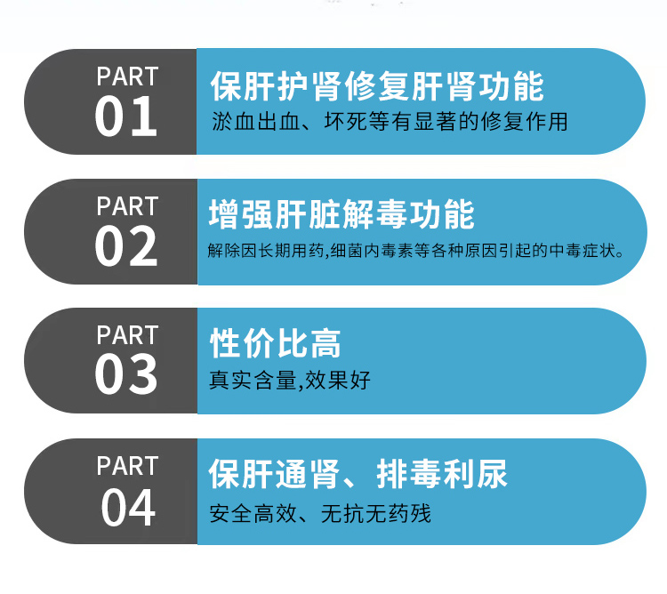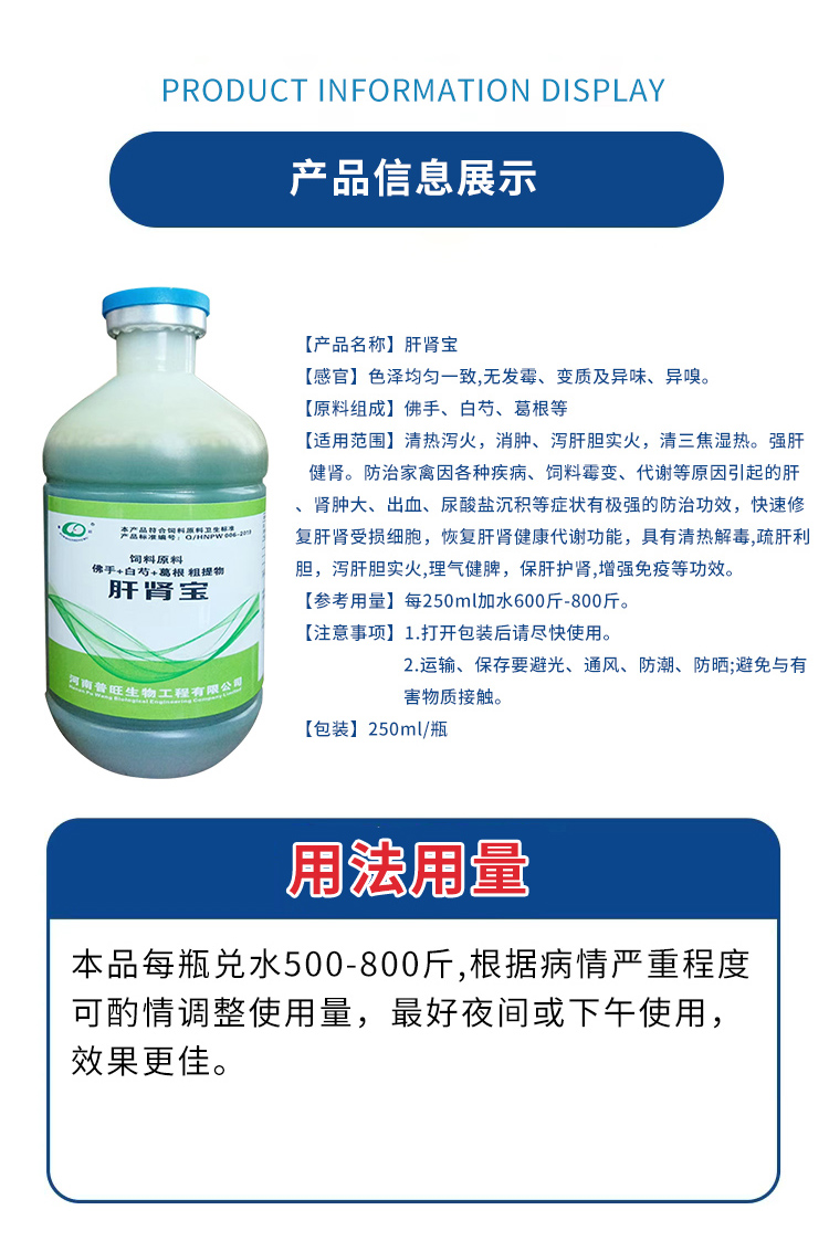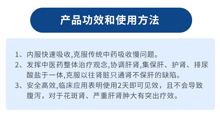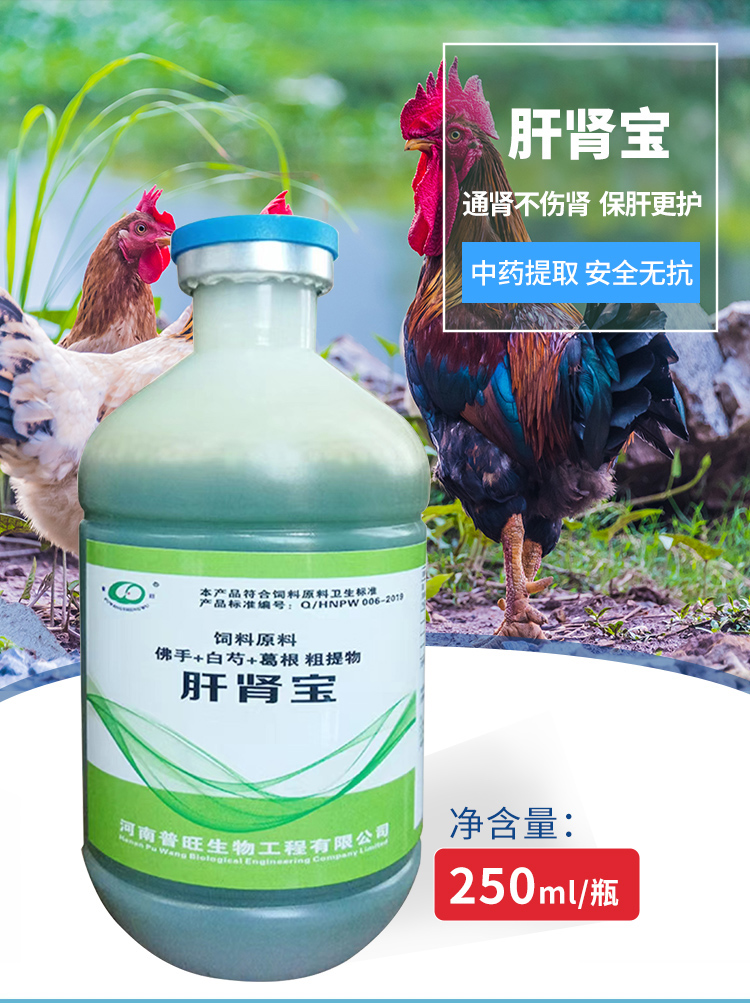 防治家禽因各種疾病、飼料霉變、代謝等原因引起的肝、腎腫大、出血、尿酸鹽沉積等癥狀有很強的防治功效,快速修復肝腎受損細胞,恢復肝腎健康代謝功能,具有清熱解毒,疏肝利膽,瀉肝膽實火,理氣健脾,保肝護腎,增強免疫等功效。