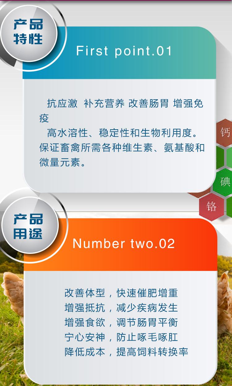 保證畜禽正常生理功能所需的各種維生素,氨基酸和微量元素,有效防止?fàn)I養(yǎng)缺乏,抗應(yīng)激;有效改善腸胃功能,刺激免疫系統(tǒng)發(fā)育,增強(qiáng)免疫力。