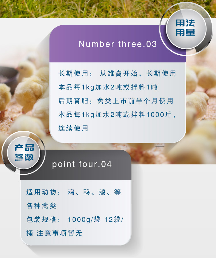 2.后期育肥:禽類上市前半個(gè)月使用,本品每1kg加水1噸或拌料1000斤,連續(xù)使用。