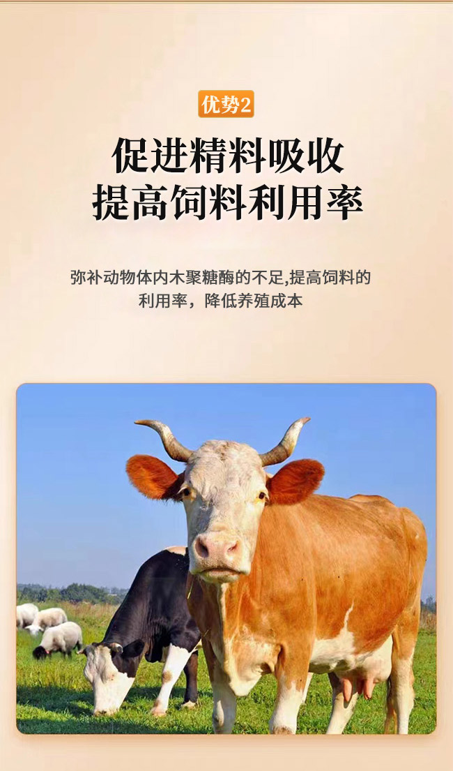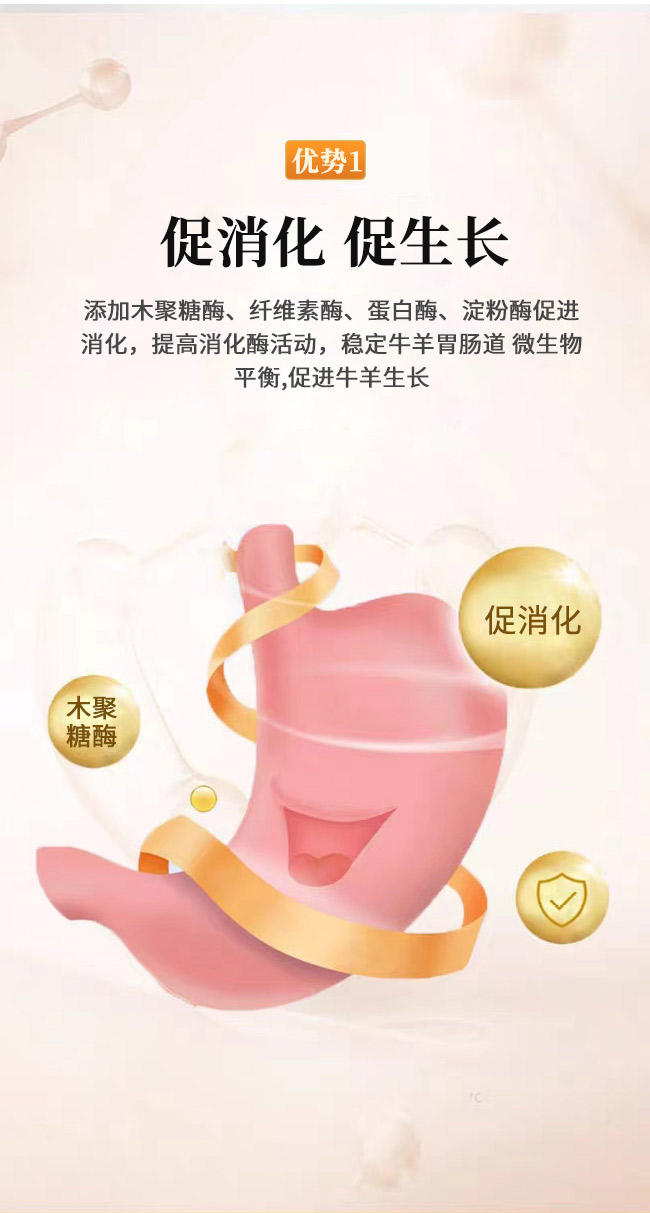 添加木聚糖酶、纖維素酶、蛋白酶、淀粉酶促進(jìn)消化,提高消化酶活動,穩(wěn)定牛羊胃腸道微生物平衡,促進(jìn)牛羊生長