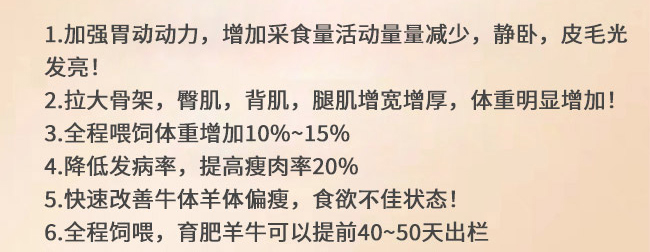 產品簡介:超硬加固型 牛羊提前出欄 加速生長 多礦物質 促肥增長 微量元素高鈣 拉長骨架 增肥增重 免疫增強